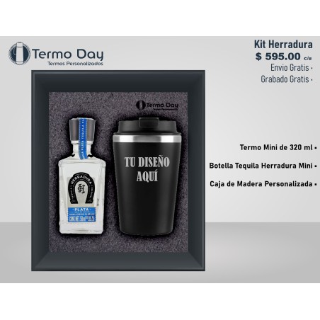 Kit mini personalizado, incluye mini botella de Tequila Herradura, termo metálico personalizado de 325 ml, estuche de madera personalizado.